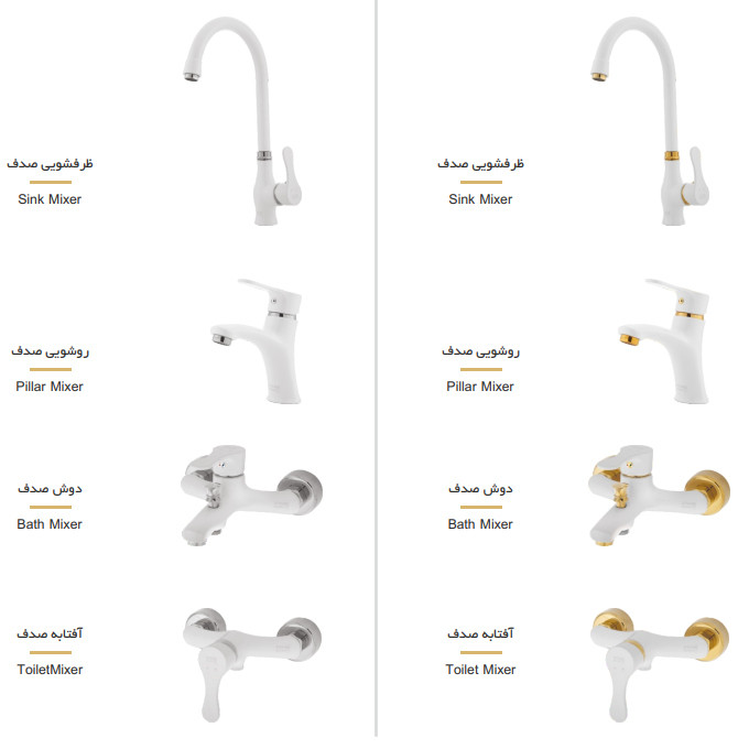سری شیرآلات شامل یک عدد شیر ظرفشویی یک عدد شیر روشویی یک عدد شیر توالت (بدون شلنگ) و یک عدد شیر دوش (بدون یونیورست دوش) می باشد که در دو رنگ سفید-کروم و سفید-طلایی قابل سفارش می باشد